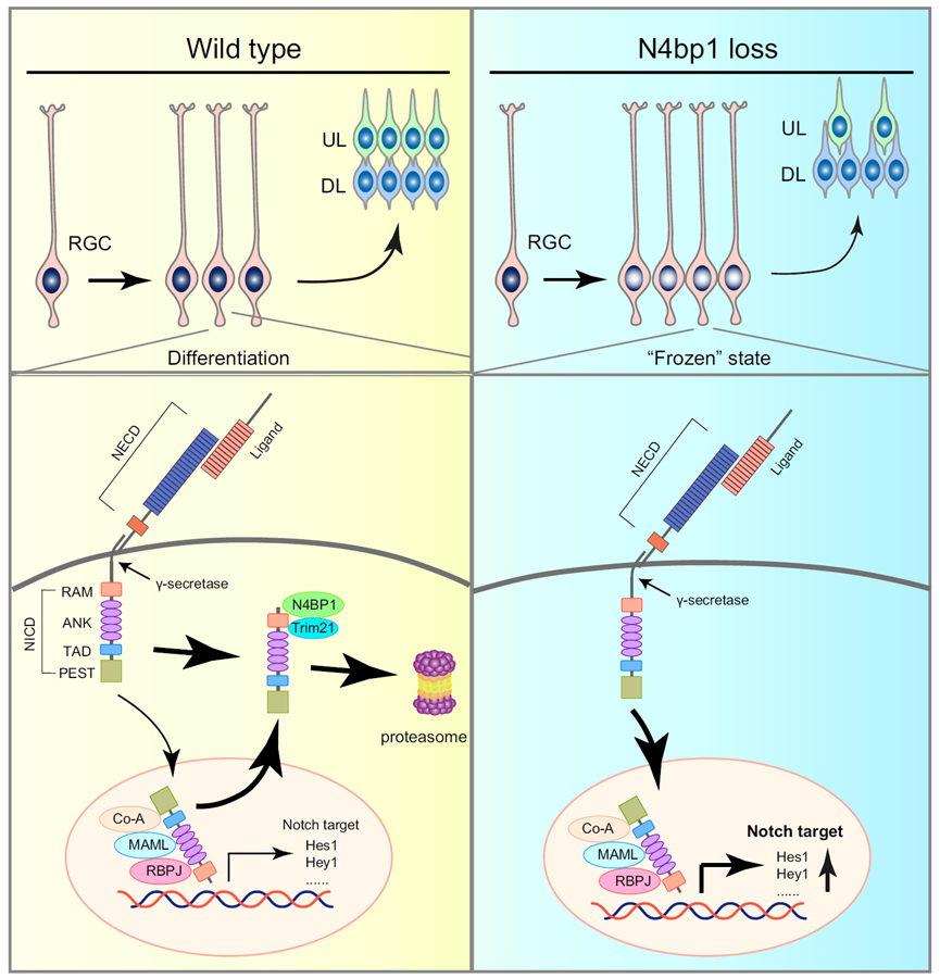 本研究证实N4BP1在大脑皮层发育过程中,具有促进神经前体细胞分化、神经元形成的作用;并且揭示了N4BP1以一种全新的方式调控Notch信号通路,即N4BP1依赖RAM结构域降解NICD,而非通过以往认知的PEST结构域;并且本研究首次揭示E3泛素连接酶Trim21参与Notch信号通路调控,这进一步促进对Notch信号调控网络的认识。此外,该研究首次报道了CoCUN这种泛素结合结构域的功能,位于N4BP1 C端的CoCUN结构域(特别是862/863位氨基酸构成的“Phe-Pro”模序)是其降解NICD中起关键的功能结构。