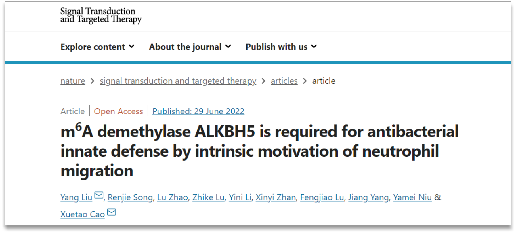 2022年6月29日,388vip太阳集团基础医学研究所暨388vip太阳集团免疫治疗研究中心曹雪涛院士团队在Signal Transduction and Targeted Therapy杂志发表了题为“m6A demethylase ALKBH5 is required for antibacterial innate defense by intrinsic motivation of neutrophil migration”的研究论文。研究报道了alkB同源物5 RNA去甲基化酶(alkB homolog 5 RNA demethylase,ALKBH5)在机体抗菌免疫防御过程中发挥着至关重要的作用,首次揭示了中性粒细胞ALKBH5及N6-甲基腺嘌呤(N6-methyladenosine,m6A)RNA修饰可以调控其迁移能力的表观新机制。