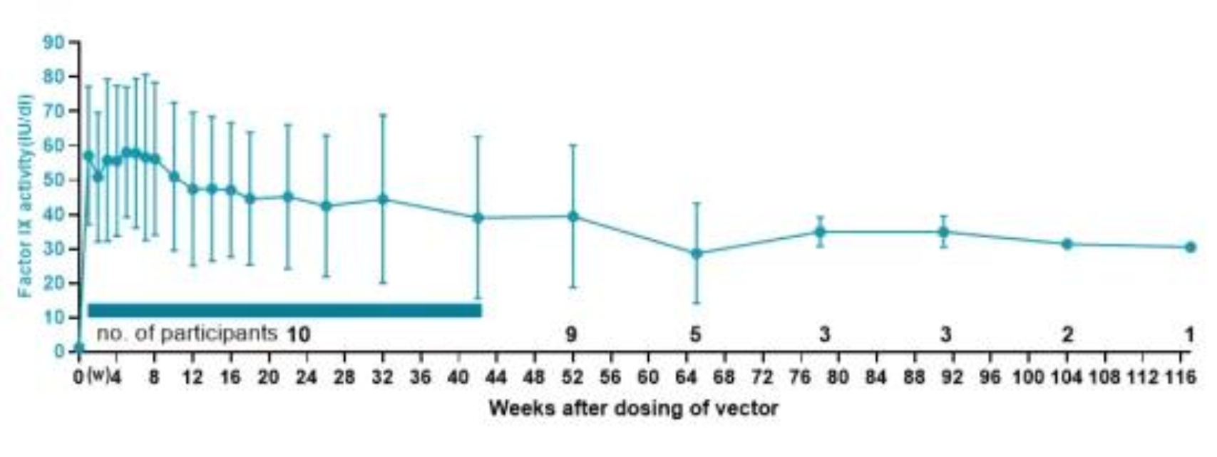 本研究团队历时2年以上,共纳入10例重型/中重型血友病B(FIX:C<2%)患者,一次静脉注射携带有凝血因子IX高活性突变体(FIX Padua)基因的AAV载体,完成中位58(IQR:50-117)周随访,载体衍生FIX:C凝血因子达到平均36.93±20.49IU/dl(图1),其中4例患者FIX:C达到或高于50IU/dl,8例患者高于20IU/dl。前3例患者分别完成了117周、104周和98周随访,FIX:C分别为30.5、31.8和38.5 IU/dl。与国际同类研究相比,本研究中的血友病B基因治疗药物(BBM-H901)起效迅速,载体衍生FIX: C在基因治疗后24h内即可表达,在48h时可达16.27±5.17IU/dl,在一周时为57.12 ± 20.18 IU/dl(均值±SD)(图2),并在中位5(IQR:1,6)周时达到FIX:C最高值64.05 ±22.53 IU/dl(均值±SD)。