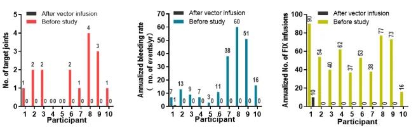 图3:基因治疗前后患者靶关节数、年化出血率及因子IX输注次数