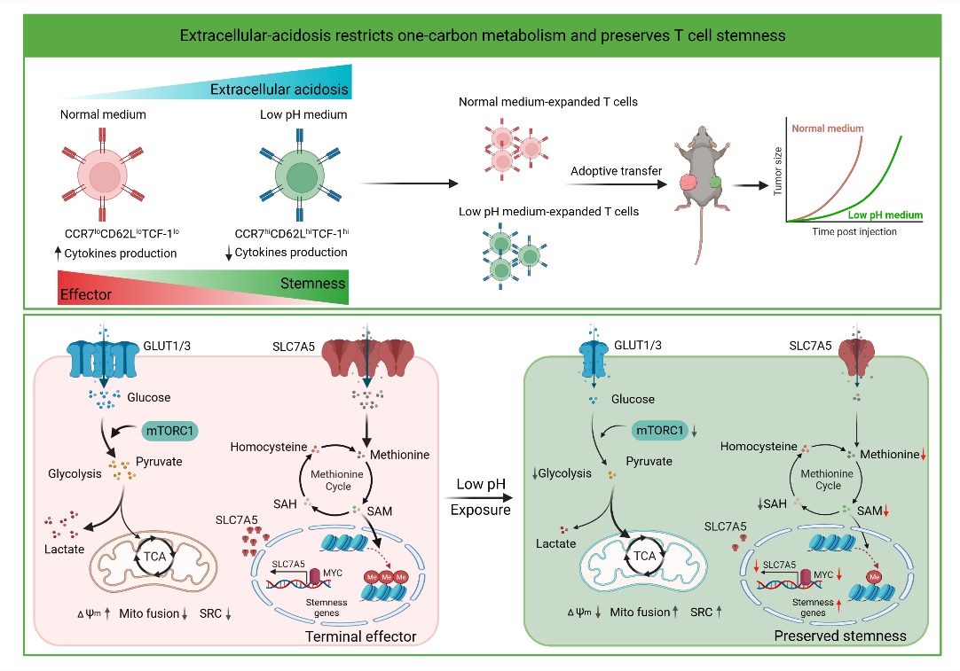 2023年1月30日,388vip太阳集团系统医学研究院/苏州系统医学研究所(简称“系统院”)李贵登、张连军团队与四川大学华西第二医院陈路团队合作在Nature Metabolism《自然-代谢》在线发表题为“Extracellular acidosis restricts one-carbon metabolism and preserves T cell stemness”(胞外酸度抑制一碳代谢维持T细胞的干性)的研究论文。该研究发现,长期胞外酸处理T细胞可抑制MYC-SLC7A5轴,阻碍T细胞内甲硫氨酸的摄入,进而重编程T细胞内的一碳代谢及表观遗传图谱,促进线粒体代谢适应性,最终维持干性T细胞状态。