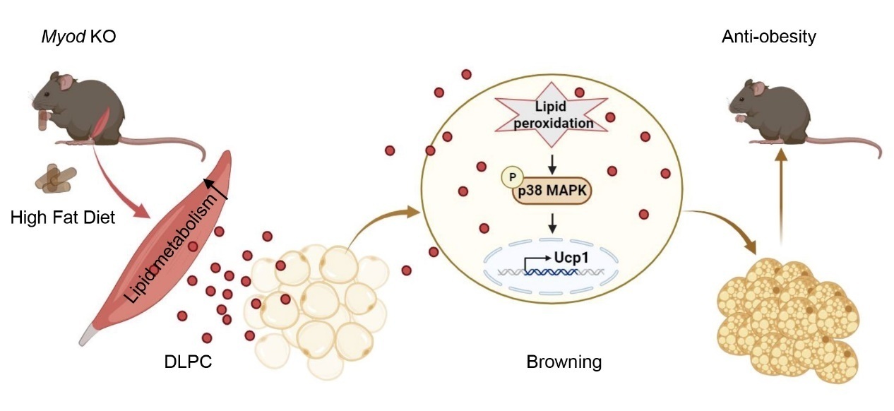 图1. MyoD调控骨骼肌分泌的DLPC经血液到达白色脂肪后通过脂质过氧化激活p38诱导iWAT棕色化并协调全身能量稳态。