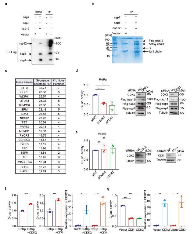 该研究基于质谱(MS)的蛋白质组学方法,鉴定了与SARS-CoV-2的RNA依赖的RNA聚合酶(RdRp)相关的宿主蛋白。在候选因子中,CDK2与RdRp 的组分nsp12相互作用,使其在T20位点磷酸化,从而促进由nsp12、nsp7和nsp8组成的RdRp复合物的组装,促进病毒RNA的高效合成。