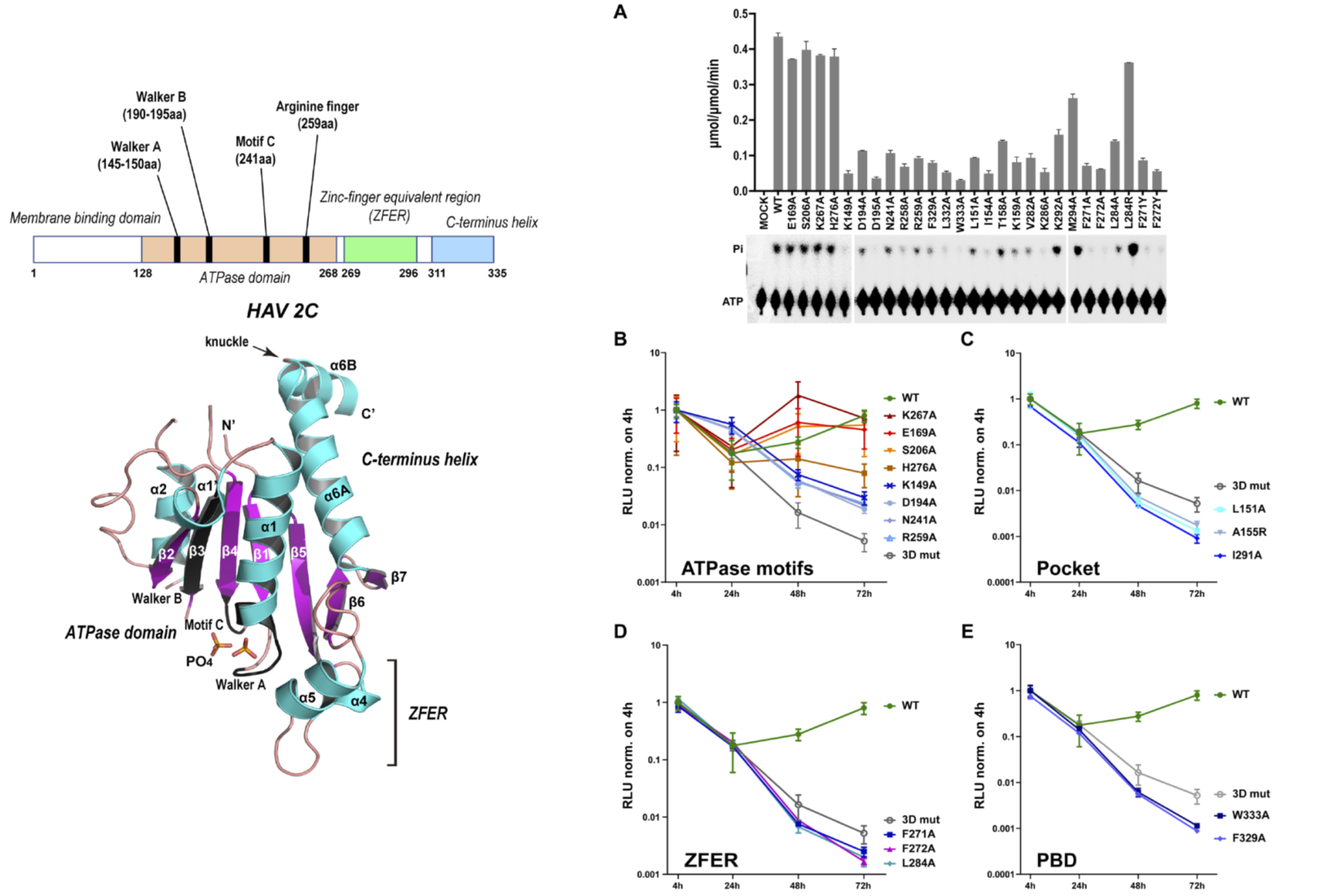 图. HAV 2C的晶体结构、保守结构域及其在ATP酶活性、病毒复制中的作用