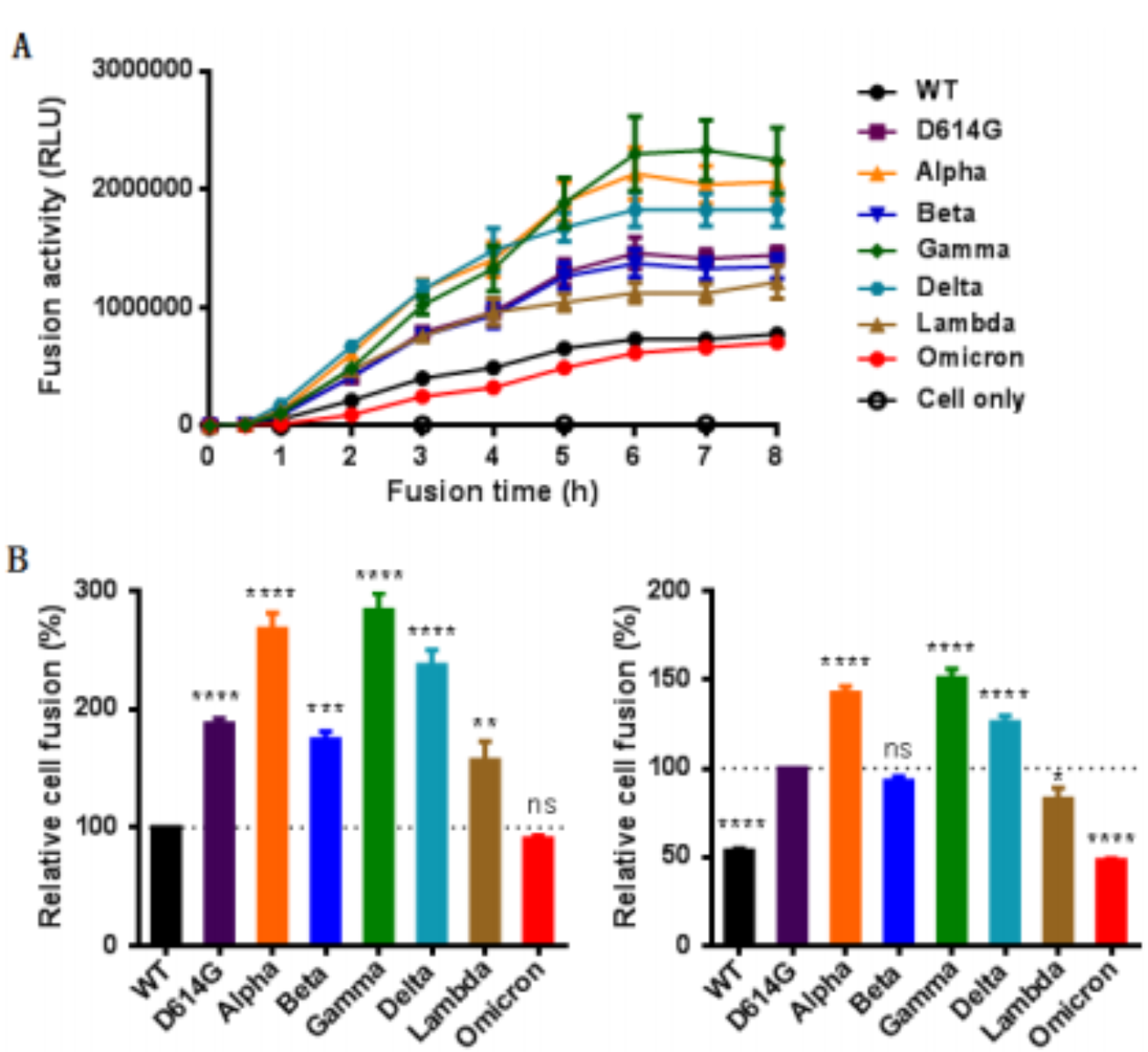 何玉先教授团队聚焦于SARS-CoV-2病毒膜融合抑制剂的研究与开发,采用病毒HR2序列设计了多个基于脂肽的高效抑制剂。该研究主要聚焦于探讨流行突变株的病毒膜融合特征及其对膜融合抑制剂IPB02V3和IPB24的抗病毒活性的影响。通过实验首先发现四种VOCs(Alpha、Beta、Gamma、Delta)和一种VOI(Lambda)变异株中多数表现出融合活性增强和假病毒感染性下降。不同的是,Omicron变异株的假病毒感染性和融合活性都显著降低。本研究验证了IPB02V3和IPB24仍然能够高效地抑制几种突变株S蛋白介导的细胞融合和假病毒感染;对Omicron真病毒感染的抑制活性显著高于原始病毒株。因此,IPB02V3和IPB24可以进一步开发为临床适用的广谱抗病毒药物,以对抗Omicron和其他新兴变体的大流行。