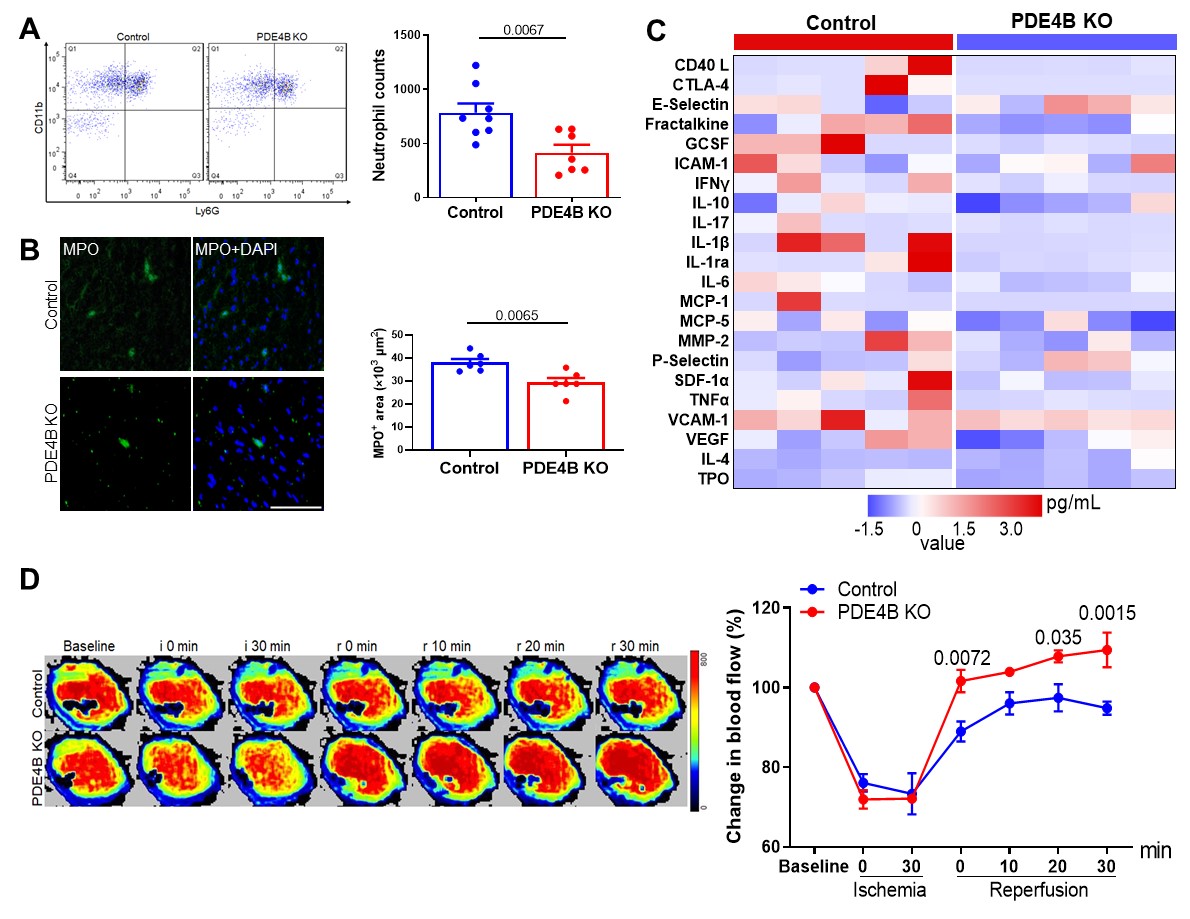 图2. PDE4B介导心肌缺血再灌注的中性粒细胞浸润 (A-B)、炎症反应 (C)和微循环 (D)