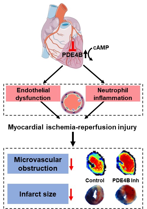 临床观察研究提示磷酸二酯酶4(PDE4,能特异降解细胞内第二信使环磷酸腺苷(cAMP))可能参与心血管疾病发生。基于前期发现激活前列腺素E受体4(一种升高cAMP水平的G蛋白偶联受体)可抑制MI/R损伤,本研究团队进一步探究了环磷酸腺苷(cAMP)代谢酶PDE4及其亚型在MI/R损伤中的作用。发现在PDE4四个亚型中,MI/R损伤后只有PDE4B表达显著上调,而敲除PDE4B后可以明显减少小鼠MI/R后的心肌梗死面积,并改善心功能。机制研究发现,PDE4B一方面通过cAMP-PKA途径介导了中性粒和内皮细胞粘附分子表达和中性粒细胞黏附血管内皮,并促进中性粒细胞迁移、炎性小体激活和炎症因子释放,从而加重MI/R损伤。另一方面,PDE4B通过cAMP-PKA-NO信号通路来调控内皮依赖的血管舒张反应,介导缺血再灌注引起的微血管闭塞,促进MI/R损伤。