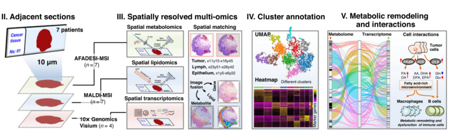 近年来,组学技术的发展极大地推动了人们对肿瘤的认识和临床精准诊治。然而,基于组织匀浆或单细胞解离的组学分析技术会破坏组织中细胞和分子所处的空间位置,无法获得高异质性肿瘤组织(微环境)中的分子和细胞的分布及相互作用信息。在前期自主研发的空间代谢组学技术的基础上,进一步整合空间脂质组学和空间转录组测序技术,在同一肿瘤组织样本的相邻切片上,实现了肿瘤组织微区中代谢组、脂质组和转录组数据的原位精准联合分析;并鉴别细胞种类,构建代谢物/脂质和上游调控基因的关联网络,实现了肿瘤组织微环境中肿瘤细胞、免疫细胞和基质细胞等代谢调控及交互作用的原位表征,为肿瘤代谢的深入研究提供了创新的有效方法、工具和新视角。