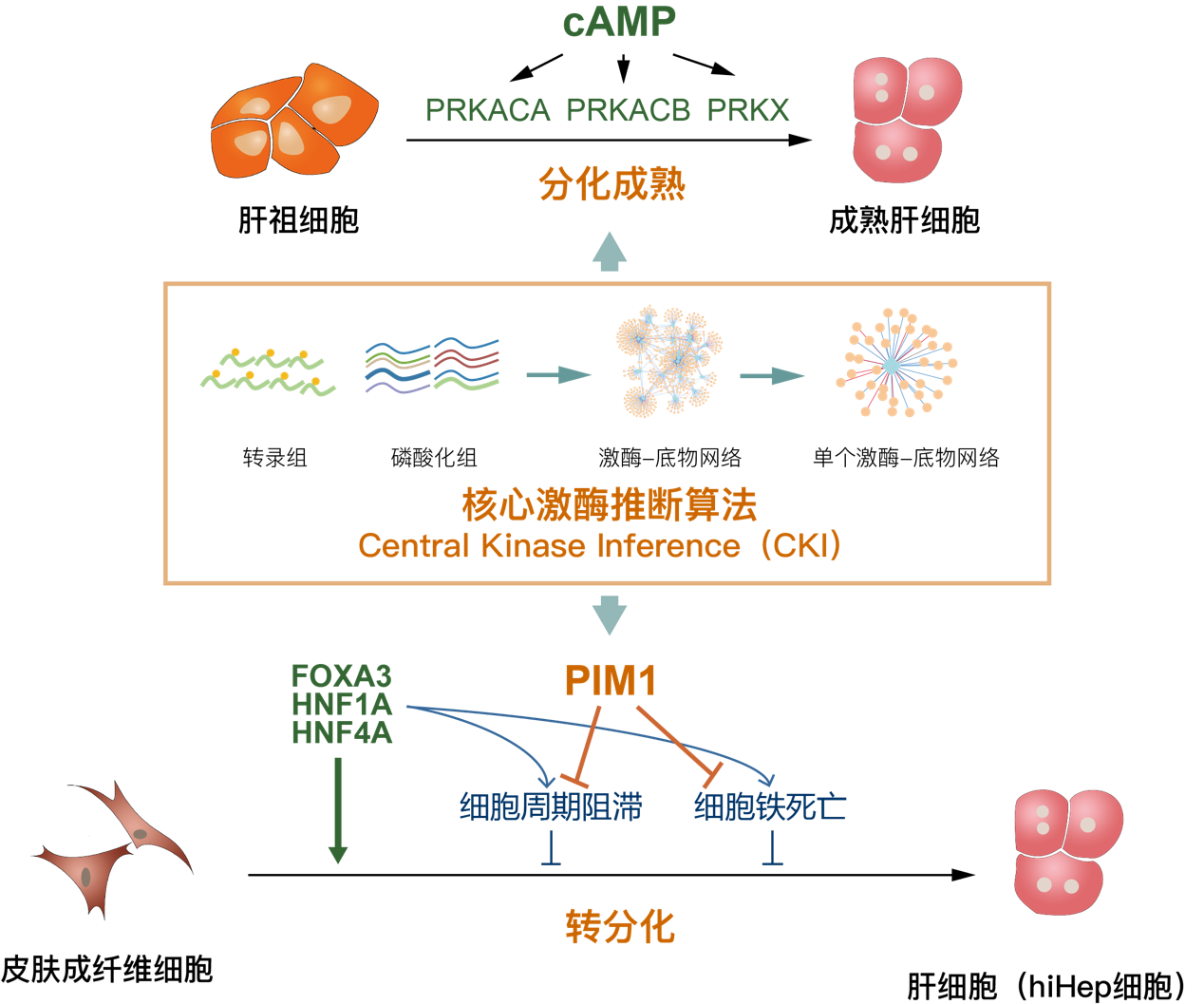 肝细胞在药物评价、细胞治疗、生物人工器官等领域具有重要的应用价值。然而,如何高效获取具有成熟功能的肝细胞一直是瓶颈问题。本研究团队基于CKI算法预测出PIM1是肝向转分化的关键调控激酶(图一)。进一步研究发现过表达PIM1可以抑制细胞命运转变导致的细胞周期阻滞和细胞铁死亡,从而大幅提高肝向转分化的效率,并能显著促进转分化肝细胞的成熟。这项工作利用CKI算法也发现了双分化潜能的小鼠肝祖细胞在向成熟肝细胞分化过程中,环磷酸腺苷(cAMP)通过蛋白激酶C的激酶活性亚基(?亚基、?亚基)、X-连锁蛋白激酶等促进肝细胞成熟的机制。该项研究不仅为更高效地获取成熟的转分化肝细胞提供了关键的机制基础,也为多组学整合的重要激酶预测提供了高效的计算方法。