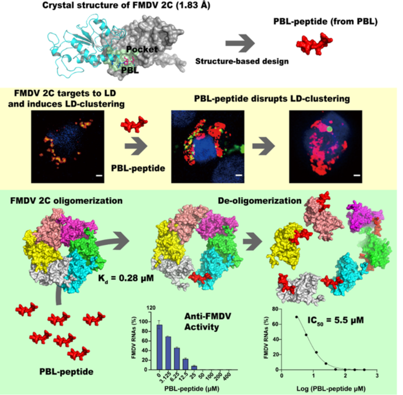 本团队研究人员首次解析了FMDV 2C高分辨率晶体结构,基于结构设计了一种抗病毒多肽(PBL-peptide)。并发现PBL-peptide能够解离2C多聚体、抑制其ATP酶活性;证明PBL-peptide与靶点具有较高亲和力(纳摩尔水平),能够破坏2C诱导的脂滴(LD)聚集。最后,研究人员还在体外活性实验,细胞模型和乳鼠模型中系统评价了PBL-peptide的抗病毒活性。PBL-peptide的设计和应用已申请国际专利。