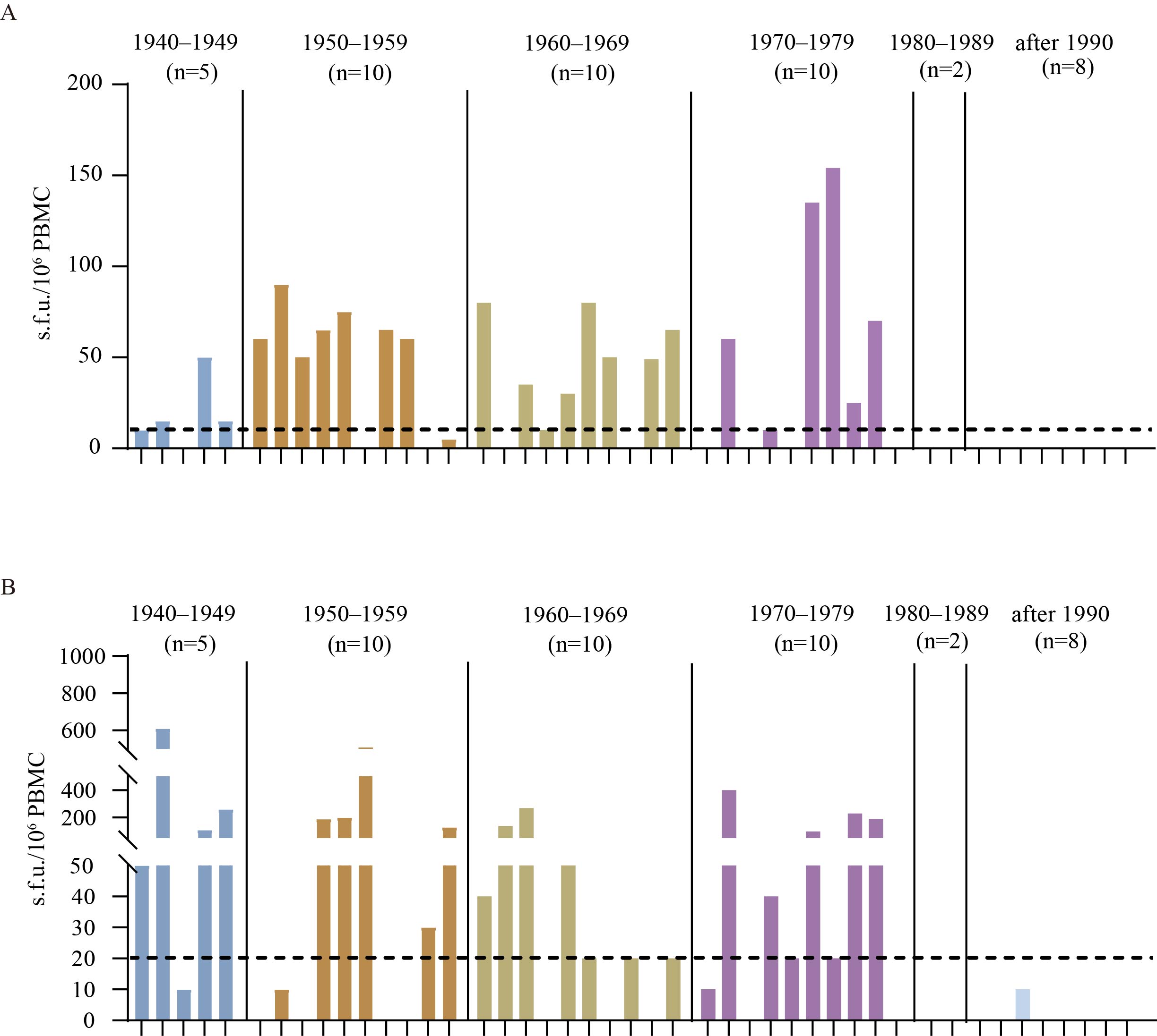 图. 不同年龄组人群针对痘苗病毒天坛株的记忆性B细胞和记忆性T细胞免疫反应