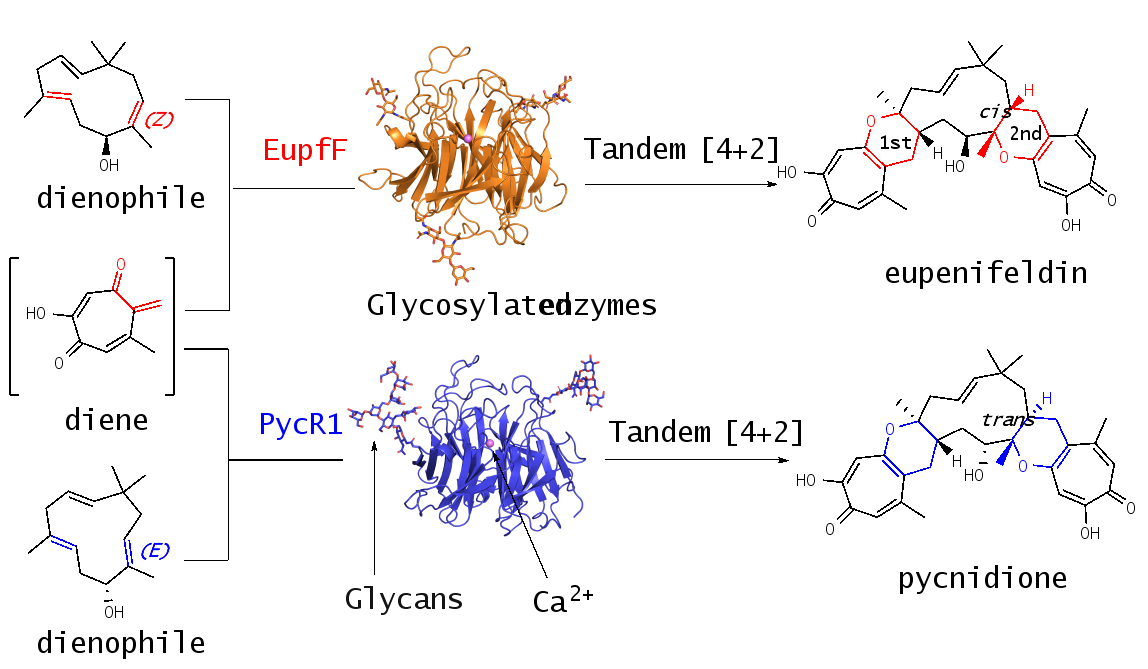 蛋白质糖基化会影响蛋白质正确折叠、分泌、亚基的聚合和信号转导等,从而在很多生物过程中发挥重要作用。然而,目前关于糖基化对生物合成酶催化功能的影响还不清楚。该论文报道了糖基化蛋白EupfF及其同源蛋白PycR1分别催化串联[4+2]环化反应,参与强效抗肿瘤天然产物eupenifeldin和pycnidione的生物合成。这两个分子是分别由制药公司百时美施宝和默克从真菌中发现的纳摩尔级抗肿瘤天然产物,因其复杂的化学结构和连续的手性中心,使其化学全合成一直未被攻破。