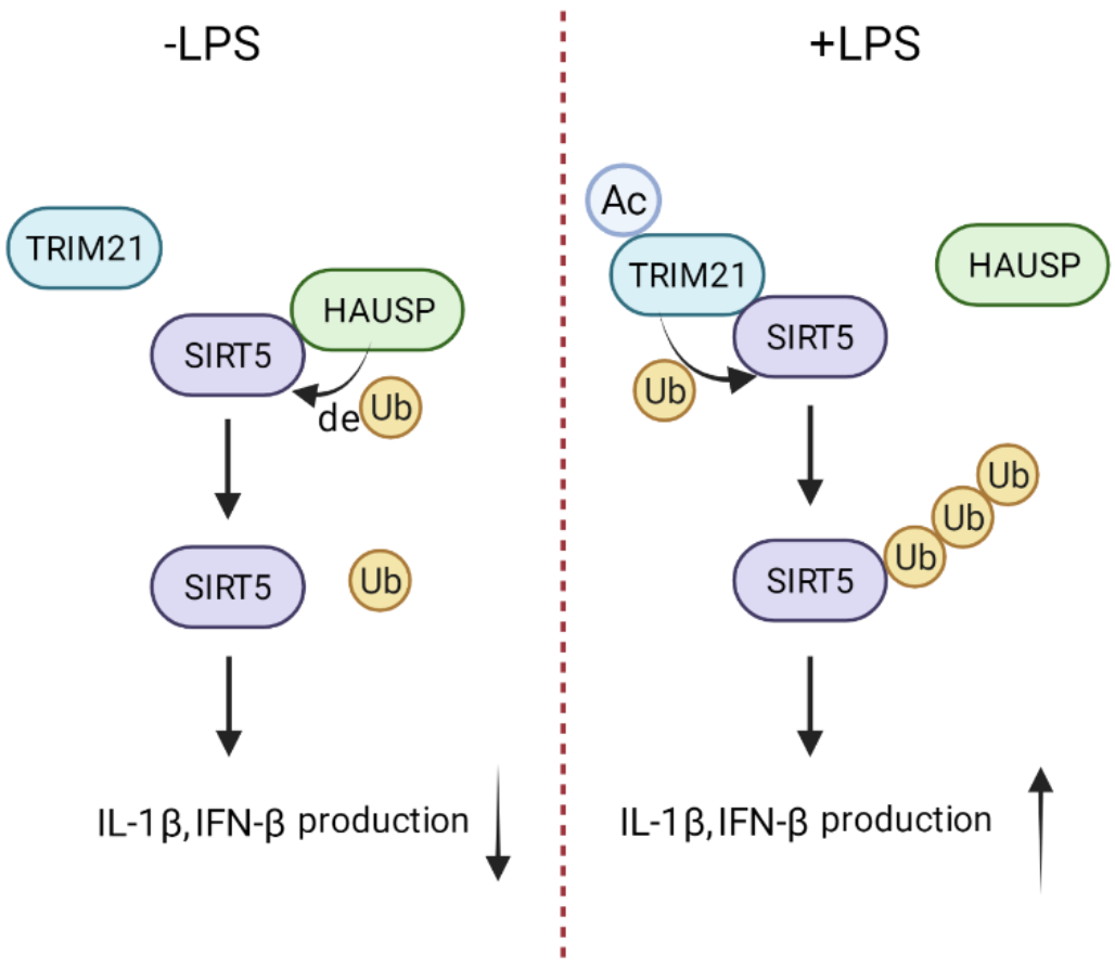 如图所示,在没有刺激的巨噬细胞内,SIRT5与HAUSP相互作用,发生去泛素化修饰,维持其较高的蛋白水平;当细胞受到LPS等刺激时,SIRT5偏向与TRIM21相互作用,TRIM21发挥泛素连接酶活性,从而介导SIRT5的蛋白降解和促进炎性因子的释放。反之,SIRT5还可以通过改变TRIM21的乙酰化修饰来调控其泛素连接酶活性。因此,通过TRIM21,LPS诱导了一个正反馈回路来控制SIRT5并使其保持在一个低水平,从而促进了炎症细胞因子的释放。该研究发现了调控SIRT5蛋白降解的泛素连接酶TRIM21,并揭示了LPS刺激导致巨噬细胞释放炎性因子的一个新的分子机制。该研究表明改变TRIM21-SIRT5相互作用的平衡可能作为一种潜在的炎症性疾病的治疗方法。