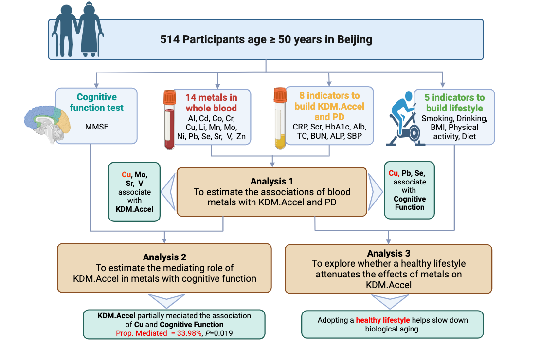 该研究是一项基于北京4个社区(村)的横断面研究,共纳入514名年龄≥50岁的中老年人,所有血样均检测14种金属浓度及多种生理生化指标(图1)。团队利用8种生理生化指标构建BA指标,使用简易精神状态量表(MMSE)评估认知功能,使用广义线性模型和中介分析探究BA在血金属与认知功能关系中的中介作用。结果显示,BA在血铜与认知功能的关系中存在显著中介效应,中介效应占比高达33.98%。进一步,研究团队构建了健康生活方式指数,并发现采取健康生活方式可以减缓BA,从而减轻金属对认知功能的不利影响。该项研究不仅深化了我们关于血金属对认知功能影响机制的理解,还为预防金属介导的认知功能下降提供了潜在的干预策略。