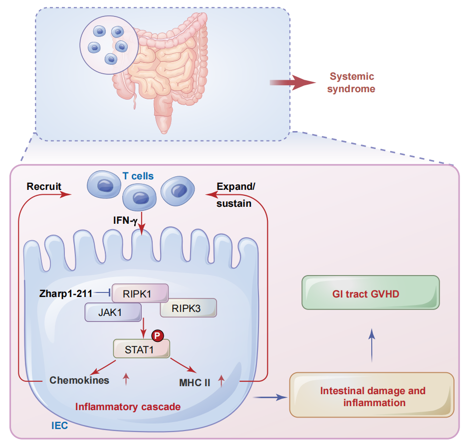 本研究团队首先发现,在小鼠肠道IEC中选择性抑制RIPK3可显著降低小鼠肠道和肝脏中的GVHD病理反应。对RIPK3上下游蛋白的研究展示,不同于RIPK3敲除或RIPK1激酶突变的小鼠,MLKL敲除的小鼠能延缓GVHD症状的出现,但后期并不能改善小鼠的总生存率。通过对小鼠肠道IEC进行转录组测序分析发现,IEC中RIPK3具有独立于MLKL、促进T细胞趋化因子和MHC II类分子产生的功能。这些分子促进肠道T细胞的浸润以及同种异体T细胞反应。进一步研究表明,RIPK1/RIPK3能够与JAK1形成复合物,增强IEC细胞中IFN-γ依赖的STAT1的激活,从而促进趋化因子与主要组织相容性复合体II(MHC II)类分子表达,募集与维持同种异体T细胞反应,最终导致肠组织损伤和GVHD的发生。临床转化研究证实在严重GVHD患者的结肠上皮中存在RIPK1的高度激活。该研究还发现了高效且具选择性的新型RIPK1激酶抑制剂(Zharp1-211),可以显著抑制IECs中JAK/STAT1介导的趋化因子和MHC II类分子的表达,降低肠道上皮细胞炎症,保护肠道干细胞与潘氏细胞,恢复肠道内稳态,有效缓解GVHD,而且不影响移植物抗白血病(graft-versus-leukemia, GVL)效应。