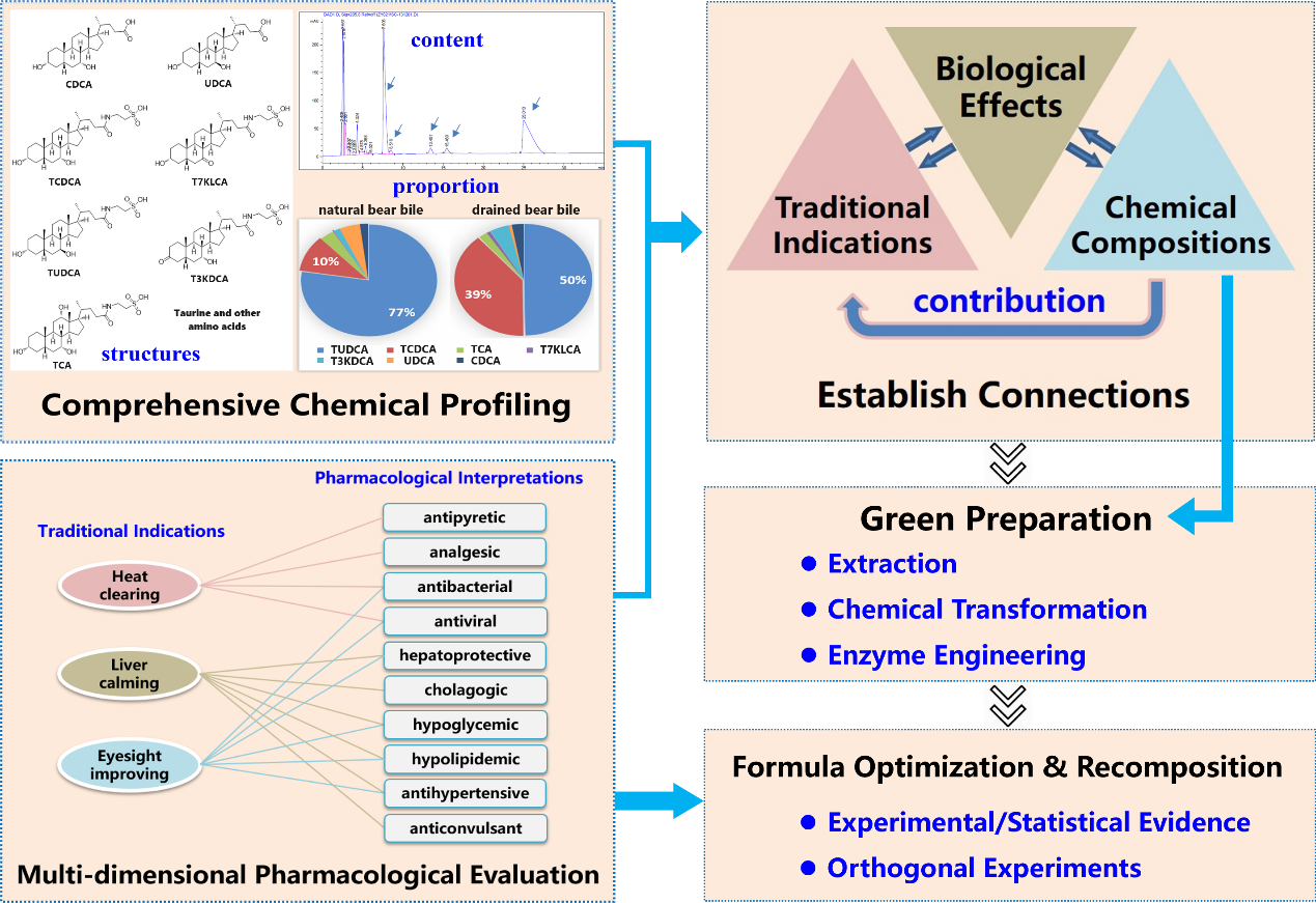 近13个世纪以来,熊胆一直是中医药中珍贵而有效的药材。然而,目前通过养熊活体取胆汁的做法因其对动物福利的不良影响而广受批评。研究熊胆替代品面临熊胆的传统功效描述与现代医学术语的壁垒;功效与化学组成之间的关系不清晰;药效物质的高效、绿色制造以及科学的组方重组等诸多科学挑战。在这项研究中,作者提出了一套新的研究策略,系统阐释熊胆传统疗效的科学内涵,整合不同学科的技术来创制人工熊胆。通过建立反映熊胆功效的多维度药效评价体系,得以全面评价熊胆的治疗效果,确定熊胆中的成分哪些是药效物质;利用化学合成和酶工程技术,实现以高效、环境友好的方式批量生产熊胆中的药效物质;基于正交实验和统计证据对人工熊胆配方进行合理优化和重组。