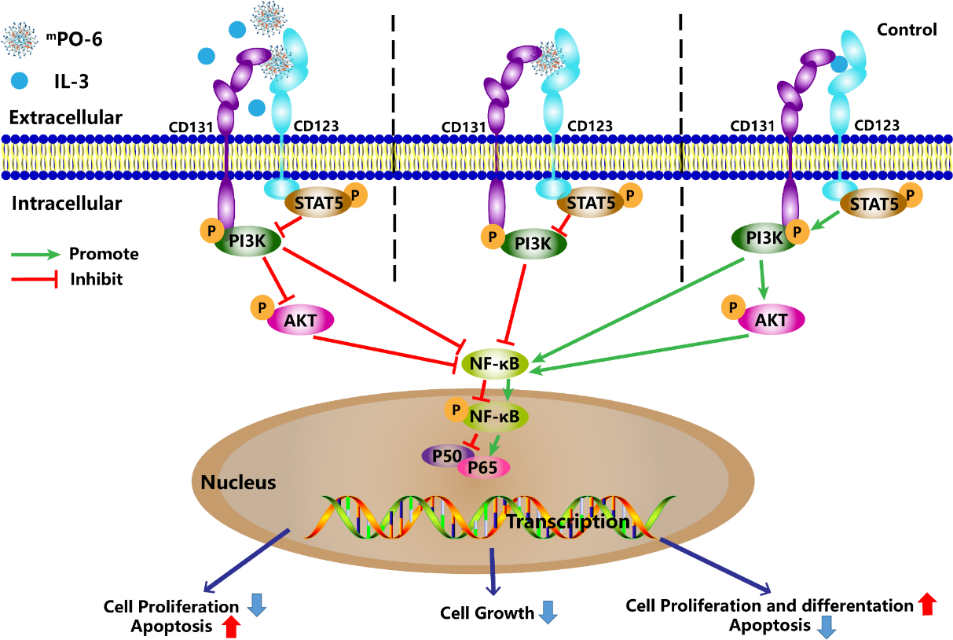 图2. mPO-6对高表达CD123的AML细胞的增殖/存活和凋亡的作用示意图。