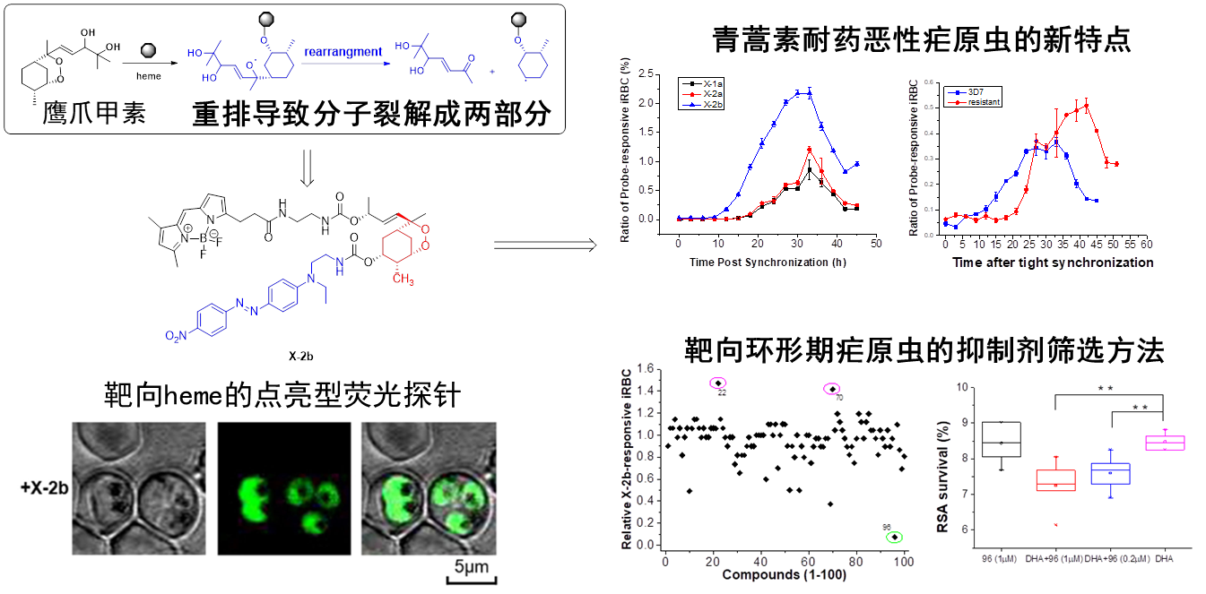 作为寄生虫的恶性疟原虫入侵人体红细胞后水解大量的血红蛋白以释放自身生长所需的氨基酸,这一过程也释放出大量游离的亚铁血红素,后者可激活青蒿素而引发其自由基介导的强效抗疟作用。因此,亚铁血红素可否成为一个可量化的指标来研究恶性疟的耐药机制?以此问题为出发点,本研究团队基于第一个结构明确的含内过氧桥键抗疟天然产物鹰爪甲素与亚铁血红素的独特作用机制,即鹰爪甲素被亚铁血红素激活使其分解为两部分的特征,设计合成了基于鹰爪甲素的亚铁血红素激活点亮型小分子荧光探针(X-2b)。该探针可非侵入性地检测恶性疟原虫中的亚铁血红素水平,发现耐青蒿素的恶性疟原虫生长周期中亚铁血红素的低水平期(环形期)发生了明显的延长(延长了约10小时);同时,研究团队通过X-2b探针建立了一种靶向环形期疟原虫抑制剂的筛选方法,成功发现了多个对环形期疟原虫有抑制作用的活性天然产物,其中活性最为显著的是扁塑藤素,其增加了耐药恶性疟对青蒿素的敏感性。研究结果表明基于鹰爪甲素的探针揭示了一个可量化的青蒿素耐药恶性疟的表型特征,并可快速筛选靶向环形期的抑制剂,为青蒿素耐药的防控和克服带来了新途径。