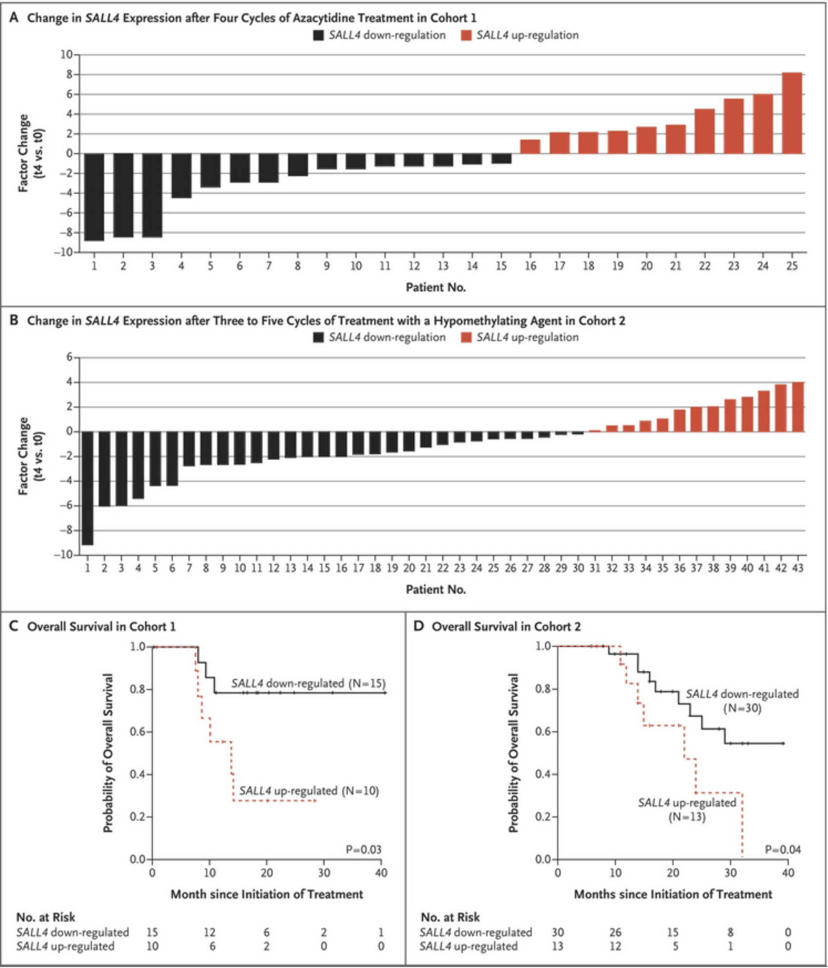 去甲基化药物地西他滨和阿扎胞苷现已被推荐为较高危骨髓增生异常综合征的一线治疗,但迄今对去甲基化药物治疗骨髓增生异常综合征的机制及疗效影响因素尚知之甚少。对于去甲基化药物是否通过去甲基化激活并上调癌基因表达从而影响疗效这一科学假说,本研究团队选取了在转基因小鼠中证实可导致骨髓增生异常综合征相关表征的癌基因SALL4作为研究对象,通过分析意大利Vor Vergata大学和388vip太阳集团血液病医院(388vip太阳集团血液学研究所)2组接受3-4个疗程去甲基化药物治疗前后配对标本SALL4基因表达改变,发现治疗后SALL4基因上调的患者治疗总体有效率和总体生存期均显著低于未上调患者。采用一种全新的CRISPR–DNMT1-interacting RNA (CRISPR-DiR)方法,用细胞系和患者原代细胞进一步证实SALL4表达上调是通过去甲基化药物对SALL4 CpG岛去甲基化后所致。本研究首次证实去甲基化药物可激活并上调癌基因表达从而影响药物的近期和远期疗效,并提示SALL4可能是骨髓增生异常综合征的一个新的治疗分子靶标,去甲基化药物联合其他不同作用机制的药物有望进一步改善临床整体疗效。
