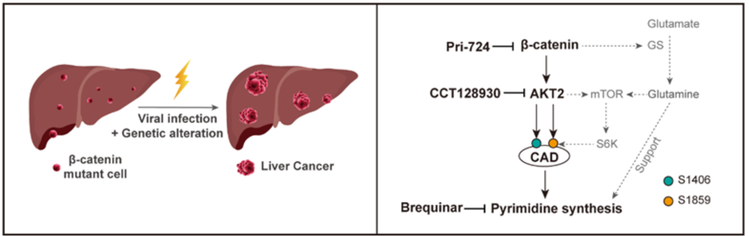 肝脏是机体主要的代谢器官,原癌基因或抑癌基因的致癌突变会改变代谢,以满足不受抑制的细胞增殖和肿瘤生长对营养和生长的需求。β-catenin编码基因(CTNNB1)是儿童最常见的肝脏恶性肿瘤—肝母细胞瘤和成人肝脏恶性肿瘤—肝细胞肝癌中突变频率最高的原癌基因,肿瘤蛋白53编码基因(TP53)则是肝癌中最常见突变的抑癌基因。本研究团队探索了β-catenin功能获得性突变在肝癌发生中的作用和病理机制,发现突变活化的β-catenin不仅引发肝脏肿瘤发生,而且加剧了TP53缺失或乙型肝炎病毒感染介导的肝癌发展。并且揭示了促进嘧啶从头合成是β-catenin突变细胞系和肝脏的主要代谢异常。致癌β-catenin刺激AKT2转录,然后AKT2激活嘧啶从头合成限速酶CAD,促进核苷酸合成。抑制β-catenin/AKT2刺激的嘧啶合成轴特异抑制β-catenin突变细胞增殖和肿瘤形成。因此,靶向β-catenin, AKT2和/或嘧啶合成可治疗β-catenin突变型肝癌和其它肿瘤。