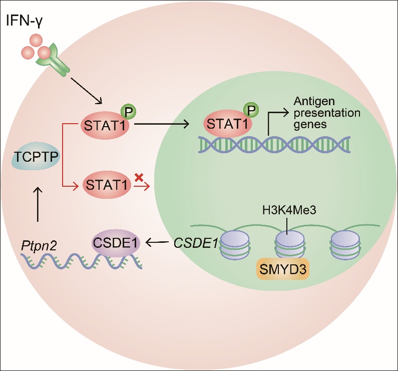 肿瘤种子细胞,亦称为肿瘤干细胞,是非常少的一群具有自我更新能力的关键肿瘤细胞,具有极强的成瘤性,是肿瘤发生的根源。本研究团队前期利用生物机械力学的原理,建立了软的三维纤维蛋白凝胶(Soft 3D fibrin gel)培养系统,能够在体外筛选、扩增肿瘤种子细胞,而在体内接种 5个细胞即可在免疫正常的小鼠体内成瘤。在本研究中,该团队成功地接种一个肿瘤种子细胞,使其能够在免疫正常小鼠体内长出肿瘤。利用该手段,团队发现单个肿瘤种子细胞,尽管在免疫缺陷的小鼠均可成瘤,但在免疫正常的小鼠体内只有一部分成瘤,一部分不成瘤。这表明肿瘤种子细胞成瘤的能力相似,但受免疫识别和监视的特性却存在差别。研究还发现,这些最终能发展成为肿瘤的种子细胞均高表达一种称之为CSDE1的RNA结合蛋白。进一步的分子机制探究揭示,原始的肿瘤种子细胞在早期扩增阶段,受微环境的生物机械力的作用,出现了表观遗传修饰的差异,导致一部分肿瘤种子细胞高表达CSDE1,而另一部分则低表达该蛋白;CSDE1通过稳定一种磷酸水解酶PTPN2的mRNA而上调其表达,PTPN2识别磷酸化的酪氨酸位点,从而使STAT1去磷酸化而失活。活化的STAT1是启动抗肿瘤免疫的关键信号,其能够使肿瘤细胞高表达肿瘤抗原,促进CD8+ T细胞识别和杀伤。因此,一旦STAT1分子失活,肿瘤种子细胞获得了肿瘤免疫逃逸的表型,进而逃避免疫攻击,最终发展成为具有临床症状的肿瘤。