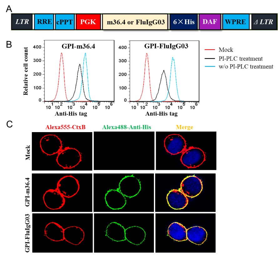 “柏林病人”和“伦敦病人”的成功治愈,提示给患者输入具有HIV抗性的造血干细胞(HSC)或T淋巴细胞有可能是治愈或功能性治愈艾滋病的有效途径。前期研究中,病原生物学研究所何玉先课题组基于强效广谱的基于多肽的HIV膜融合抑制剂,通过GPI锚定方式成功制备了广谱HIV抗性细胞(J Virol, 2019)。与多肽膜融合抑制剂作用靶点不同,本研究利用靶向gp120蛋白亚基的HIV纳米抗体m36.4,证实了细胞膜表面表达的HIV纳米抗体GPI-m36.4能有效地抑制游离病毒(Cell-free virus)和细胞相关病毒(Cell-associated virus)的入侵和感染。此外,机制研究发现GPI-m36.4能够影响病毒包膜蛋白(Env)的加工处理过程和子代病毒的感染性,从而提示其多途径的抗病毒作用。该研究从不同角度证实了强效纳米抗体制备HIV抗性细胞的能力,提供了一个新的基因治疗策略,为开展艾滋病基因治疗的深入研究奠定了基础。本研究结果于2021年1月18日在Cellular & Molecular Immunology上发表了题为《Generation of HIV-Resistant Cells with a Single-Domain Antibody: Implication for HIV-1 Gene Therapy》的论文。