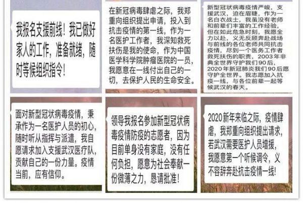 突如其来的疫情,让大家都措手不及。当疫情防控 战役打响时,很多医生都放弃休假提前回京。在第一时间,医院同时接到很多医生和护士的请求,请求到抗击疫情的第一线去。泌尿外科主动报名请战的医生有 17名,护士有 10 名。从老主任到年轻大夫到研究生,个个踊跃报名。“国家兴亡、匹夫有责”“养兵千日用兵一时”,每一条都是那么真诚,每一条都是那么恳切。 在疫情面前,妇科人表现出高度的责任感。在初五、初六半天门诊中,妇科有一位医生有湖北籍人员接触史,需要自行隔离 2周。当妇科吴令英主任在微信中询问大家是否可以替班时,四位医生同时回复:“主任,明天上午我去吧”,温暖着大家,鼓励着每一个人。 疫情考验着门诊的各个岗位。门诊部的护士王素梅是家里的顶梁柱,上有卧床生病的老人,下有需要照顾的孩子,但她说,“我不会说豪言壮语,但我会随时随地听从组织调遣。”门诊部护士张启霞说,“我随时可以到岗,共渡难关!”有这样一群战友和同志在,我们 一定能克服困难打赢这场阻击战。
