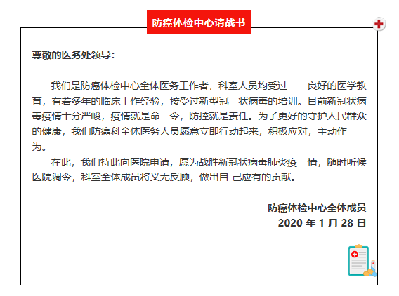 春节,一个对华夏儿女寓意深远的词汇。正当全国人民喜气洋洋迎接佳节到来之时,一场突如袭来的新型冠状病毒感染肺炎疫情,让医院一如既往的坚守显得格外的不平凡。肿瘤医院全体干部职工,是一支始终忠诚于党,忠诚于人民,忠诚于祖国健康事业的队伍。面对疫情,医院迅速组建了应对肺炎疫情应急医疗后备队,选派30名经验丰富的专业医护行政人员,组成2个梯队,时刻准备响应国家召唤,奔赴前线抗击疫情。面对春节后开诊的巨大考验,全院职工更是万众一心,坚守岗位,服从调派,积极响应,誓将为打赢这场阻击战做出自己的贡献。