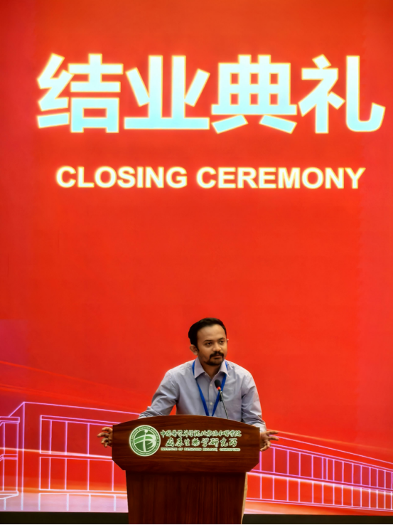 孟加拉国发展科学与健康计划研究所Abu Bakar Siddik先生作为学员代表发言,他首先代表所有学员向授课老师、志愿者为学员提供的先进课程和周到服务表示感谢。他认为此次培训班拓展了他的见解,并激发了他学习更多知识的兴趣。不同国家的学员形成了一个真正丰富多彩的多元文化联盟,彼此建立了深厚的友谊,这段培训经历让他终身难忘。
