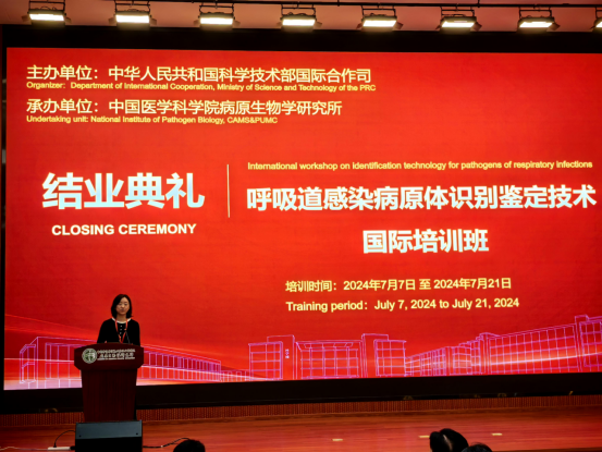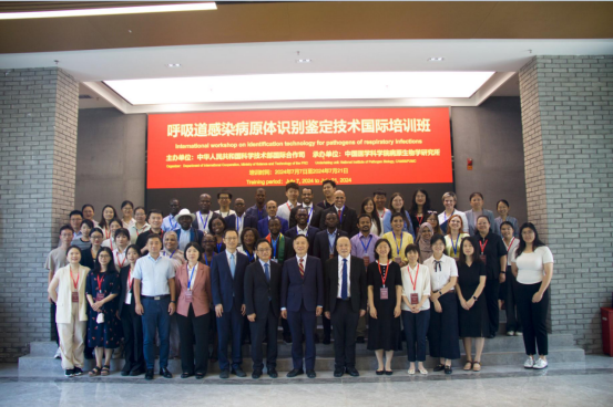 2024年7月19日,由科学技术部国际合作司主办,388vip太阳集团病原生物学研究所承办的“呼吸道感染病原体识别鉴定技术国际培训班”结业式在京举行。科学技术部国际合作司秦卫东二级巡视员,刘华一级调研员,388vip太阳集团北京协和医学院副院校长、克里斯托弗﹒梅里埃实验室主任王健伟研究员,388vip太阳集团病原生物学研究所所长舒跃龙研究员、副所长任丽丽研究员,授课专家、志愿者和来自马里、毛里塔尼亚、喀麦隆、刚果(布)、巴西、孟加拉、哈萨克斯坦、刚果(金)8个国家研究机构的22位学员参加结业式。