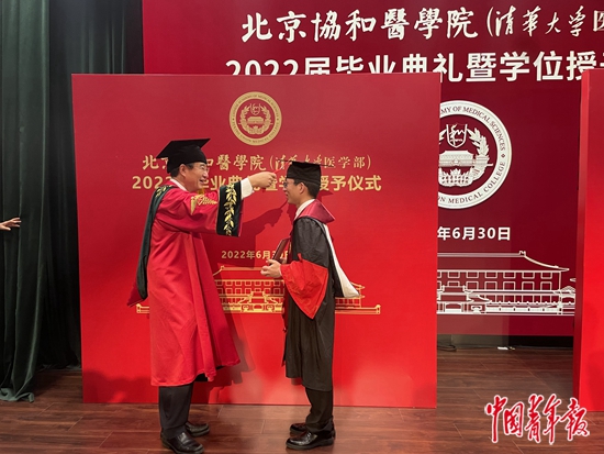 2022年6月30日,北京协和医学院举行2022届毕业典礼暨学位授予仪式,王辰院士正在为毕业生拨穗。(资料图片)中青报·中青网记者 刘昶荣/摄