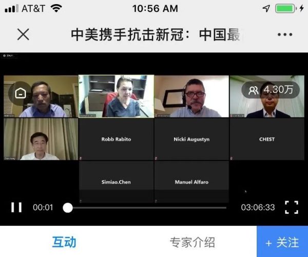 当前新冠肺炎疫情在全球蔓延,美国内确诊人数快速增加,中美双方应加强合作,共同抗疫。本次研讨会为中美医学专家开展交流合作提供了良好平台,希望双方通过这种形式的交流能更有效地应对新冠肺炎疫情。