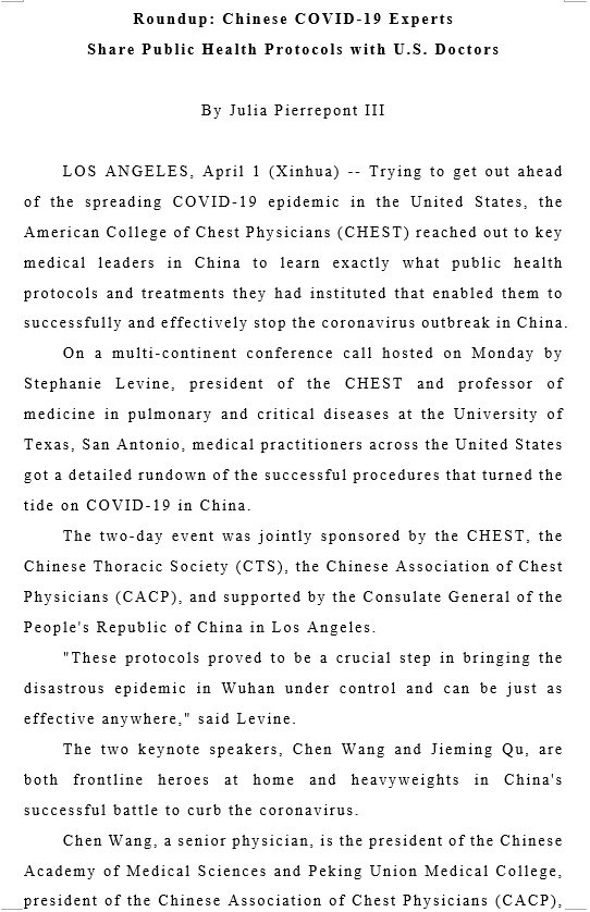 编者的话 3月30日,美国胸腔医师学会(CHEST)、中国呼吸学会、中国呼吸医师协会和中国驻洛杉矶总领事馆共同举办了2场“中美携手抗击新冠:中国高级别专家向美国同行分享最前线经验”网络研讨会,研讨会由美国胸腔医师学会主席StephanieLevine教授主持,388vip太阳集团院长王辰院士、上海瑞金医院院长瞿介明、中日友好医院副院长曹彬、中日友好医院呼吸与危重症医学科主任詹庆元等中国顶尖专家向美国医护人员分享了中国抗击新冠肺炎的成功经验,引起中美两国医学界和媒体广泛关注。