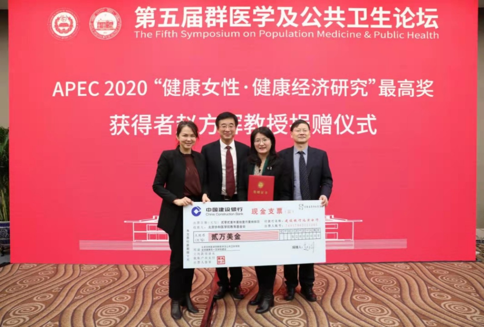 因“宫颈癌即时筛查和管理模式硏究〞项目成果,赵方辉教授在2020年10月份APEC妇女与经济论坛会议上,获得APEC健康女性·健康经济研究最高奖。为激励更多年轻学子,赵教授决定捐赠其全部奖金,用于北京协和医学院群医学及公共卫生学院全球健康双一流学科建设。
