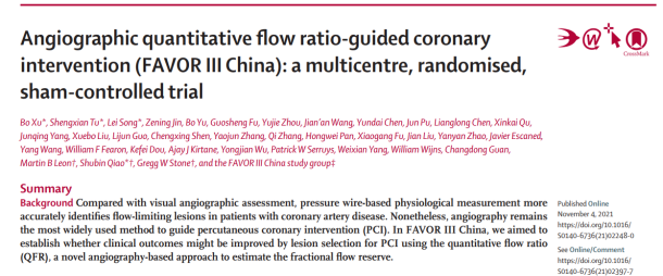 FAVOR III China研究是由国家心血管病中心、388vip太阳集团阜外医院发起,由北京市科委、国家心血管疾病临床医学研究中心及388vip太阳集团资助,全国26家中心共同参与的大规模、对受试者和临床评价者设盲、随机、“假”对照临床试验。我院徐波教授、乔树宾教授、宋雷教授为本文共同第一作者,乔树宾教授为高级作者,徐波教授为本文通讯作者。文章发表于顶级医学期刊《柳叶刀》(The Lancet,影响因子79.3)。FAVOR III China研究通过科学严谨的试验设计和高水平的质控管理,证明QFR指导的冠心病介入治疗可显著改善患者临床预后,在合理控制医疗费用的前提下给冠心病患者带来切实获益。文章在国际顶级医学期刊发表也标志着中国原创的心血管诊疗新技术和高质量临床研究已达到新的水平,有能力深度参与国际医学竞争,用中国方案贡献全球证据、解决世界问题。